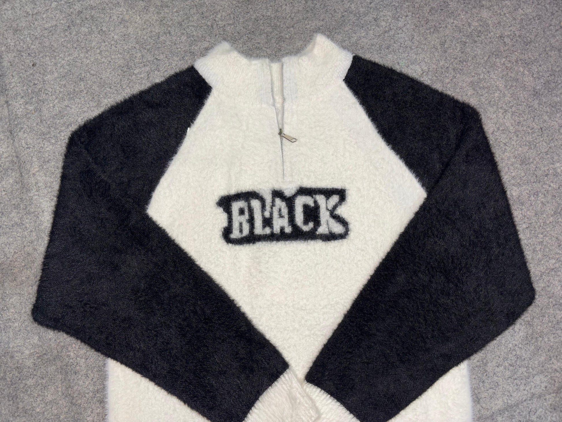 Crafted from ultra-soft sherpa fleece, it delivers unmatched warmth and comfort while staying breathable. The color-blocked black and off-white panels give it a strong visual edge, while the textured “BLACK” applique graphic adds a retro statement vibe.